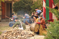 Niestety, nie była to długa chwila. Nagle zza murów dobiega hałas bębnów, do którego dołącza powoli narastający odgłos dęcia w kobzy. Przez otwartą bramę wchodzą kolejni przebierańcy, niestety, tym razem nie nastawieni tak pozytywnie. Na dziedzińcu zapanowało zamieszanie, aby wkrótce wyłoniła się z niego pierwsza fala obrońców. Pierwszy rząd oddaje salwę przed siebie, drugi w pośpiechu sypie proch w muszkiety, ubija, wkłada kulę, podpala lont. Za chwilę kolejny huk nieskoordynowanych wystrzałów, powoli cały dziedziniec zapełnia się dymem.